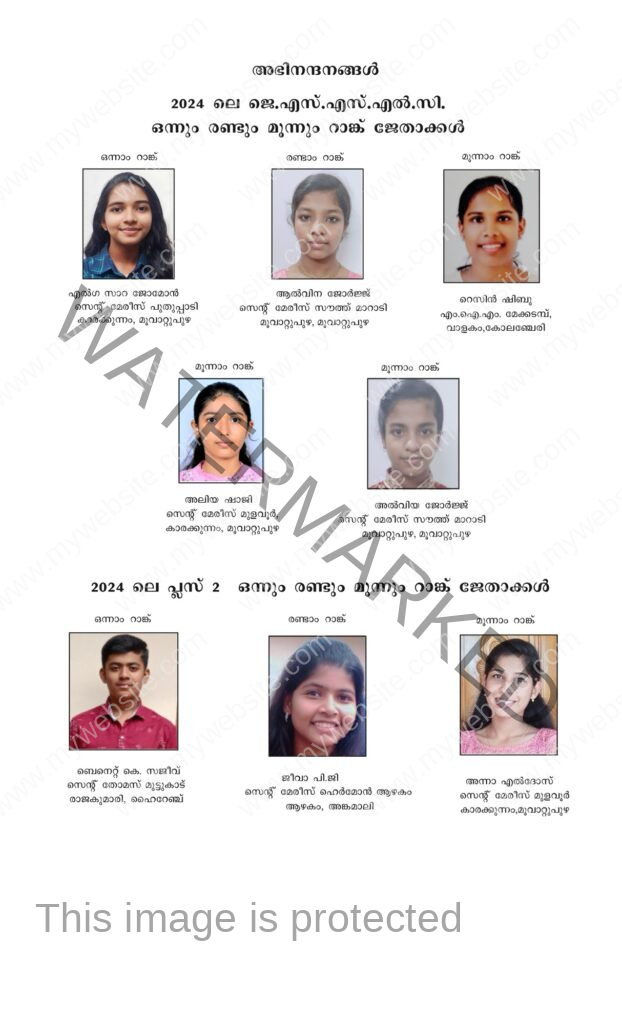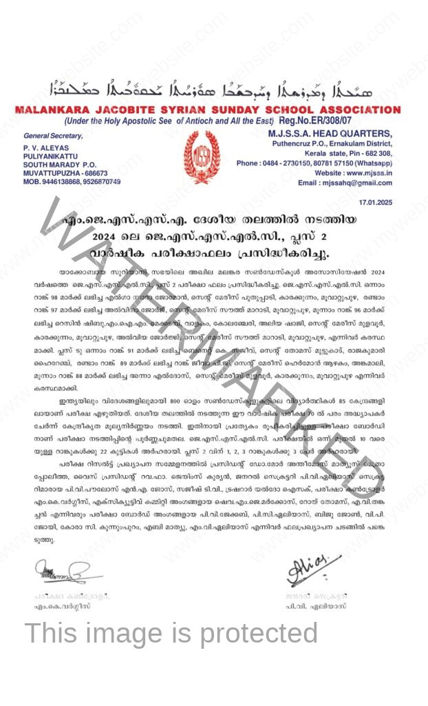 പുത്തൻകുരിശ് ● യാക്കോബായ സുറിയാനി സഭയിലെ അഖില മലങ്കര സൺഡേസ്കൂൾ അസ്സോസിയേഷൻ (എം.ജെ.എസ്.എസ്.എ.) 2024 വർഷത്തെ ജെ.എസ്.എസ്.എൽ.സി., പ്ലസ് 2 പരീക്ഷാ ഫലം പ്രസിദ്ധീകരിച്ചു. ജെ.എസ്.എസ്.എൽ.സി. ഒന്നാം റാങ്ക് 98 മാർക്ക് ലഭിച്ച എൽഗ സാറ ജോമോൻ (സെന്റ് മേരീസ് പുതുപ്പാടി, കാരക്കുന്നം-മൂവാറ്റുപുഴ), രണ്ടാം റാങ്ക് 97 മാർക്ക് ലഭിച്ച അൽവിന ജോർജ്ജ് (സെന്റ് മേരീസ് സൗത്ത് മാറാടി-മൂവാറ്റുപുഴ), മൂന്നാം റാങ്ക് 96 മാർക്ക് ലഭിച്ച റെസിൻ ഷിബു (എം.ഐ.എം. മേക്കടമ്പ്, വാളകം-കോലഞ്ചേരി), അലിയ ഷാജി (സെന്റ് മേരീസ് മുളവൂർ, കാരക്കുന്നം-മൂവാറ്റുപുഴ), അൽവിയ ജോർജ്ജ് (സെന്റ് മേരീസ് സൗത്ത് മാറാടി-മൂവാറ്റുപുഴ) എന്നിവർ കരസ്ഥമാക്കി.