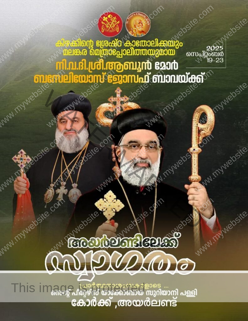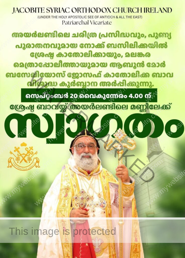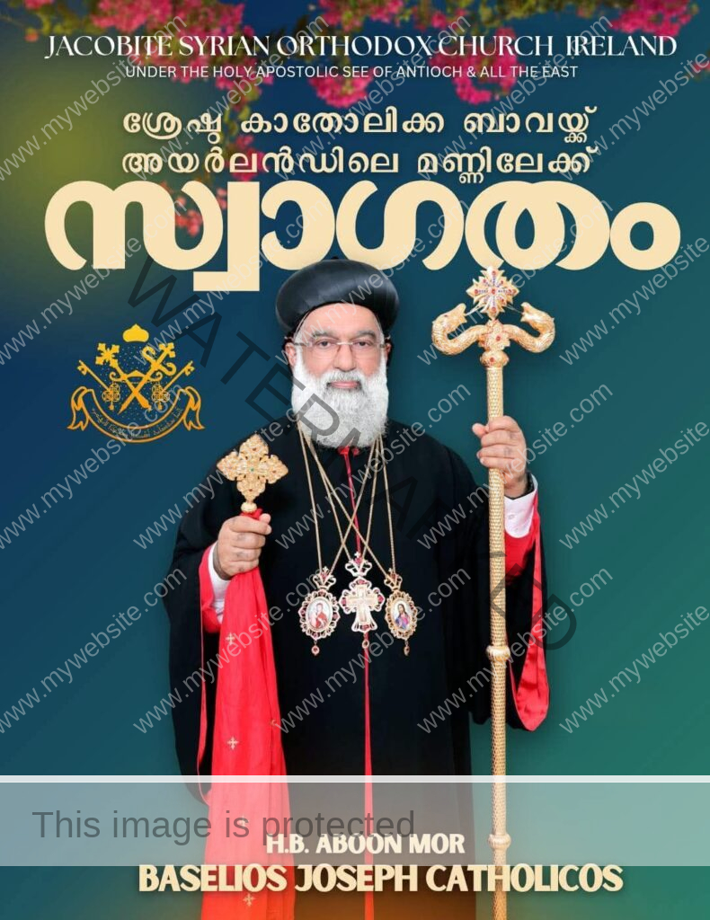 ഡബ്ലിൻ ● യാക്കോബായ സുറിയാനി ഓർത്തഡോക്സ് സഭയുടെ ശ്രേഷ്ഠ കാതോലിക്കായും മലങ്കര മെത്രാപ്പോലീത്തായുമായ ആബൂൻ മോർ ബസ്സേലിയോസ് ജോസഫ് ബാവായെ വരവേല്ക്കാന് അയര്ലണ്ടിലെ വിശ്വാസി സമൂഹം ഒരുങ്ങി. കാതോലിക്ക സ്ഥാന ലബ്ധിക്കു ശേഷം ആദ്യത്തെ അയര്ലണ്ട് സന്ദര്ശനം ഗംഭീര ആഷോഘമാക്കാനുള്ള എല്ലാ ഒരുക്കങ്ങളും പൂര്ത്തിയായതായി ഭാരവാഹികൾ അറിയിച്ചു.