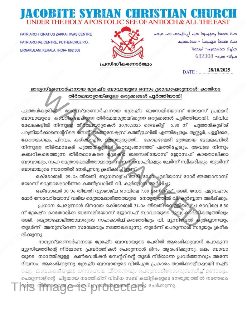 പുത്തന്കുരിശ് ● ഭാഗ്യസ്മരണാര്ഹനായ ശ്രേഷ്ഠ ബസ്സേലിയോസ് തോമസ് പ്രഥമന് ബാവായുടെ കബറിങ്കലേക്കുള്ള തീര്ത്ഥയാത്രയ്ക്കുള്ള ഒരുക്കങ്ങള് പൂര്ത്തിയായി. വിവിധ മേഖലകളില് നിന്നുള്ള തീര്ത്ഥയാത്രകള് നാളെ (ഒക്ടോബർ 30 വ്യാഴം) വൈകിട്ട് 5.30-ന് പുത്തന്കുരിശ് പാത്രിയര്ക്കാ സെന്ററിലെ സെന്റ് അത്തനേഷ്യസ് കത്തീഡ്രലില് എത്തിച്ചേരും.