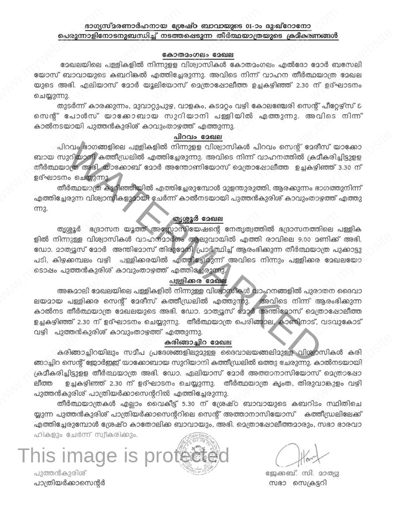 ഭാഗ്യസ്മരണാര്ഹനായ ശ്രേഷ്ഠ ബാവായുടെ ഒന്നാം ശ്രാദ്ധപ്പെരുന്നാളിനോടനുബന്ധിച്ച് നടത്തപ്പെടുന്ന തീര്ത്ഥയാത്രയുടെ ക്രമീകരണങ്ങള്: