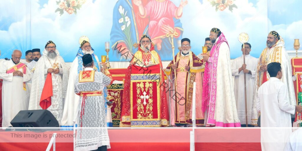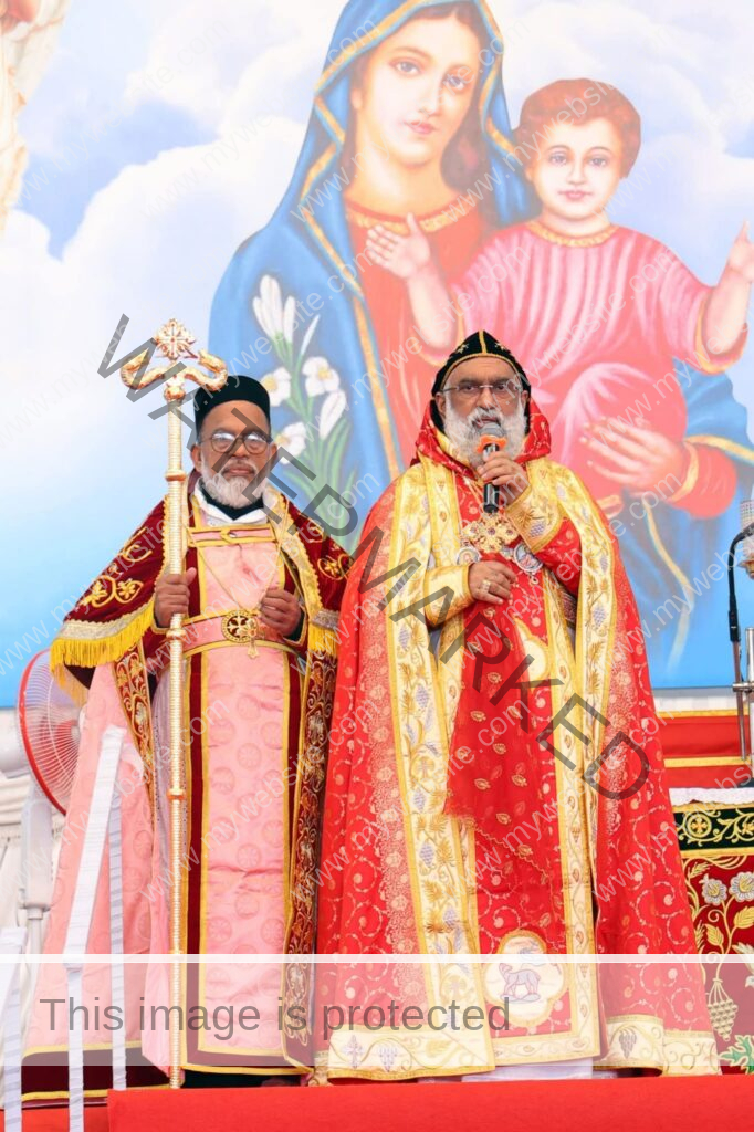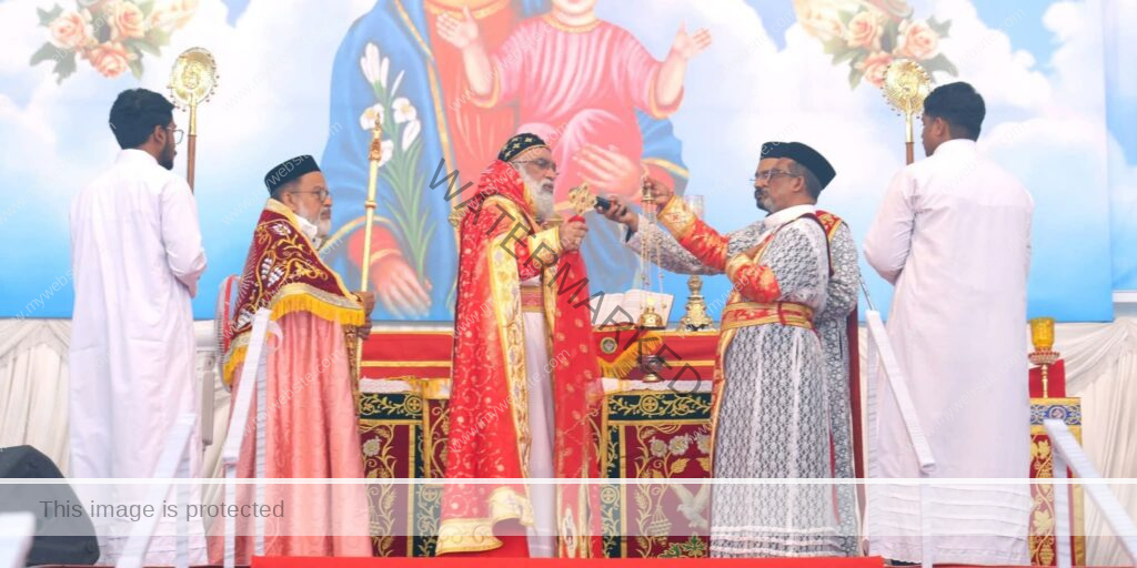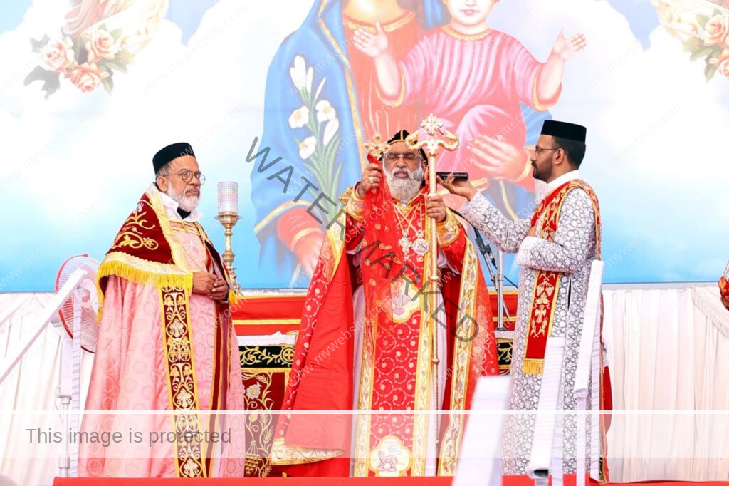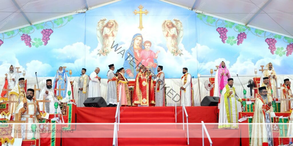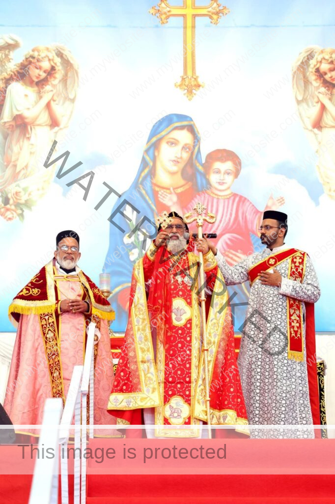 കത്തീഡ്രലിന്റെ മുറ്റത്തൊരുക്കിയ താൽക്കാലിക മദ്ബഹയിൽ മുകൾനിരയിലെ പരിശുദ്ധ ദൈവമാതാവിന്റെ നാമത്തിലുള്ള ബലിപീഠത്തിൽ ശ്രേഷ്ഠ കാതോലിക്ക ആബൂൻ മോർ ബസ്സേലിയോസ് ജോസഫ് ബാവ മുഖ്യകാർമികനായി. അഭിവന്ദ്യ മോർ തീമോത്തിയോസ് തോമസ്, ഡോ. മോർ തെയോഫിലോസ് കുര്യാക്കോസ്, മോർ ഐറേനിയോസ് പൗലോസ്, മോർ ഒസ്താത്തിയോസ് ഐസക് എന്നീ മെത്രാപ്പോലീത്തമാരും താഴത്തെ നിരകളിൽ കോറെപ്പിസ്കോപ്പമാരും മണർകാട് കത്തീഡ്രലിലെ വൈദികരും സഭാ വൈദിക ട്രസ്റ്റി ഫാ. റോയി ജോർജ് കട്ടച്ചിറ, വൈദിക സംഘം സെക്രട്ടറി ഫാ. ജോൺ ഐപ്പ് മങ്ങാട്ട് എന്നിവരും തീർഥാടനദേവാലയങ്ങളിലെയും കോട്ടയം ഭദ്രാസനത്തിലെയും വൈദികരും സഹകാർമികത്വം വഹിച്ചു.