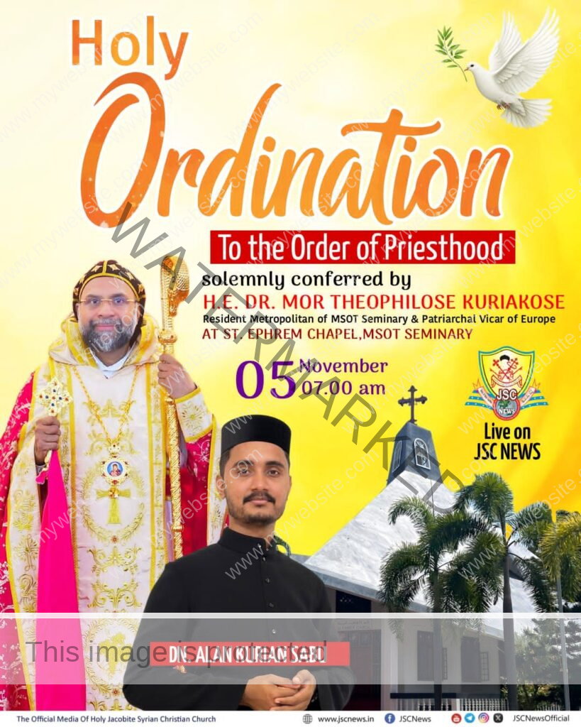 വെട്ടിക്കൽ ● തിരുവനന്തപുരം സെന്റ് പീറ്റേഴ്സ് യാക്കോബായ സുറിയാനി ഓർത്തഡോക്സ് സിംഹാസന കത്തീഡ്രൽ ഇടവകാംഗമായ ഡീക്കൻ അലൻ കുര്യൻ സാബു നാളെ (നവംബർ 5 ബുധനാഴ്ച) വെട്ടിക്കൽ ഉദയഗിരി എം.എസ്.ഒ.റ്റി സെമിനാരിയിലെ സെന്റ് എഫ്രേം ചാപ്പലിൽ വെച്ച് സെമിനാരി റെസിഡന്റ് മെത്രാപ്പോലീത്തായും, യൂറോപ്പ് ഭദ്രാസനാധിപനുമായ അഭിവന്ദ്യ ഡോ. മോർ തെയോഫിലോസ് കുര്യാക്കോസ് മെത്രാപ്പോലീത്തായുടെ തൃക്കരങ്ങളാൽ കശ്ശീശ സ്ഥാനത്തേക്ക് ഉയർത്തപ്പെടുന്നു. രാവിലെ 7 മണിക്ക് വിശുദ്ധ കുർബ്ബാനയോടെ പട്ടംകൊട ശുശ്രൂഷകൾ ആരംഭിക്കും.