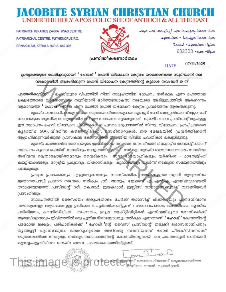 ‘ഹോപ്പ്’ (HOPE) എന്ന പേരിൽ ലഹരി വിമോചന കേന്ദ്രം പ്രവർത്തനം ആരംഭിക്കുന്നു.