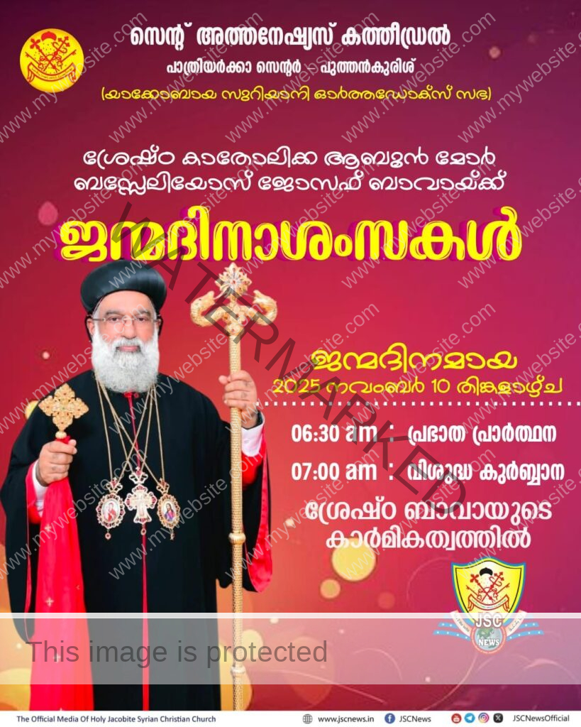 ജന്മദിനമായ നാളെ (നവംബർ 10 തിങ്കളാഴ്ച) രാവിലെ 7 മണിക്ക് ശ്രേഷ്ഠ കാതോലിക്ക ബാവ പുത്തൻകുരിശ് പാത്രിയർക്കാ സെന്ററിലെ സെൻ്റ് അത്തനേഷ്യസ് കത്തീഡ്രലിൽ വിശുദ്ധ കുർബ്ബാന അർപ്പിക്കും.