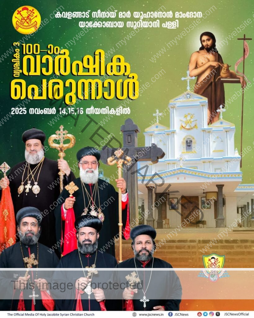 കോതമംഗലം ● കവളങ്ങാട് സീനായ് മോർ യൂഹാനോൻ മാംദോന യാക്കോബായ സുറിയാനി പള്ളിയിൽ വൃശ്ചികം 3 പെരുന്നാളും 100-ാമത് ശിലാസ്ഥാപന പെരുന്നാളും നവംബർ 14, 15, 16 (വെള്ളി, ശനി, ഞായർ) തീയതികളിൽ കൊണ്ടാടും.