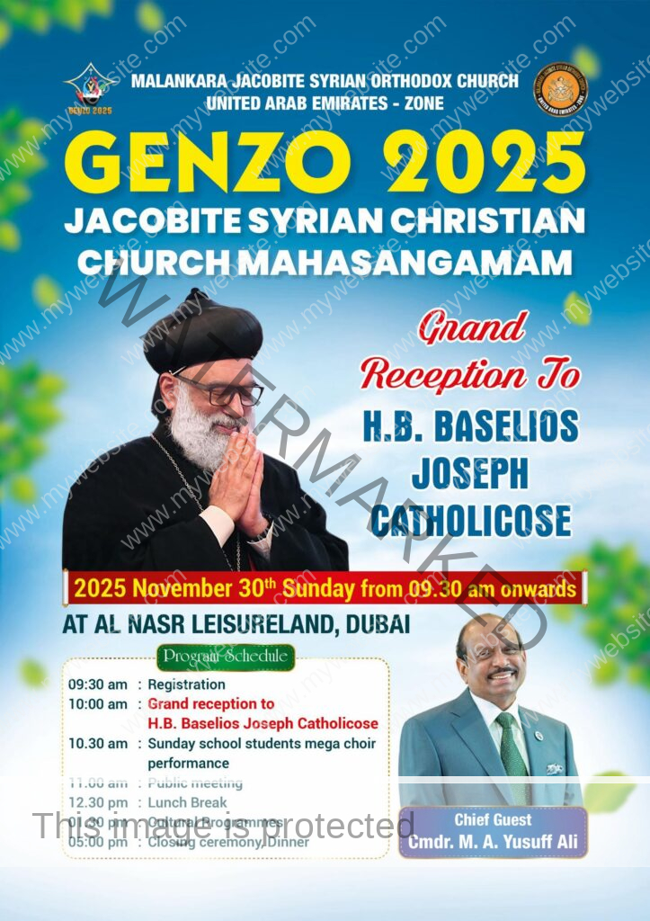 ദുബായ് ● യാക്കോബായ സുറിയാനി ഓർത്തഡോക്സ് സഭ യു.എ.ഇ മേഖല മഹാസംഗമവും ശ്രേഷ്ഠ കാതോലിക്കായും മലങ്കര മെത്രാപ്പോലീത്തായുമായ ആബൂൻ മോർ ബസ്സേലിയോസ് ജോസഫ് ബാവായ്ക്ക് സ്വീകരണവും നവംബർ 30 ഞായറാഴ്ച രാവിലെ 10 മണിക്ക് ദുബായ് അൽ നാസർ ലഷർ ലാൻഡിൽ നടക്കും.