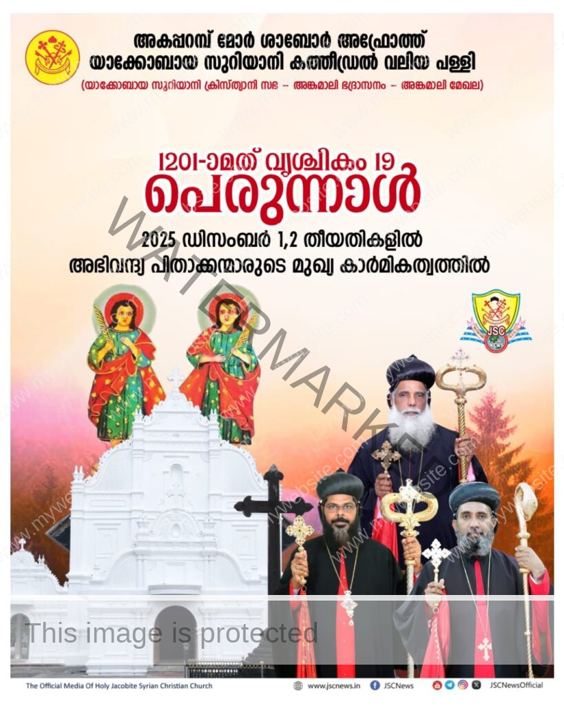 അങ്കമാലി ● ഭാരതത്തിലെ അതിപുരാതന ദൈവാലയവും അങ്കമാലിയിലെ ക്രൈസ്തവരുടെ മാതൃദൈവാലയവുമായ ചരിത്ര പ്രസിദ്ധമായ അകപ്പറമ്പ് മോർ ശാബോർ അഫ്രോത്ത് യാക്കോബായ സുറിയാനി കത്തീഡ്രൽ വലിയപള്ളിയുടെ 1201-ാമത് വൃശ്ചികം 19 പെരുന്നാളും സത്യവിശ്യാസ സംരക്ഷകൻ പരിശുദ്ധനായ പൗലോസ് മോർ അത്താനാസിയോസ് വലിയ തിരുമേനിയുടെ ഓർമ്മപ്പെരുന്നാളും ഡിസംബർ 1, 2, 3 തീയതികളിൽ കൊണ്ടാടും.