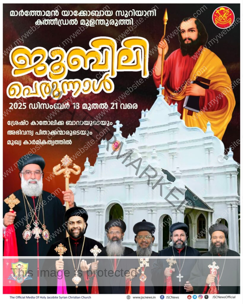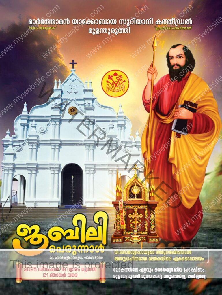 മുളന്തുരുത്തി ● പുരാതനവും, ചരിത്രപരവുമായ മുളന്തുരുത്തി മാർത്തോമ്മൻ യാക്കോബായ സുറിയാനി കത്തീഡ്രലിൽ മോർ തോമാശ്ലീഹായുടെ ചരമ സ്മരണയുടെ ഭാഗമായി ജൂബിലി പെരുന്നാൾ ഡിസംബർ 18 മുതൽ 21 വരെ ഭക്ത്യാദരപൂർവ്വം കൊണ്ടാടും. നാളെ ഡിസംബർ 18 വ്യാഴാഴ്ച രാവിലെ 7.15-ന് ശ്രേഷ്ഠ കാതോലിക്കായും മലങ്കര മെത്രാപ്പോലീത്തായുമായ ആബൂൻ മോർ ബസ്സേലിയോസ് ജോസഫ് ബാവ കൊടി ഉയർത്തും. തുടർന്ന് 7.30-ന് പ്രഭാത പ്രാർത്ഥന, 8.30-ന് അഭിവന്ദ്യ ഡോ. മോർ തെയോഫിലോസ് കുര്യാക്കോസ് മെത്രാപ്പോലീത്തയുടെ മുഖ്യ കാർമികത്വത്തിൽ വി. മൂന്നിന്മേൽ കുർബ്ബാന, ധൂപപ്രാർത്ഥന എന്നിവ നടക്കും. ഉച്ചയ്ക്ക് 1 മണിക്ക് പ്രദക്ഷിണം വൈകിട്ട് 7 മണിക്ക് സന്ധ്യാപ്രാർത്ഥന, 9.30 ന് ആശീർവാദം എന്നിവ ഉണ്ടാകും.