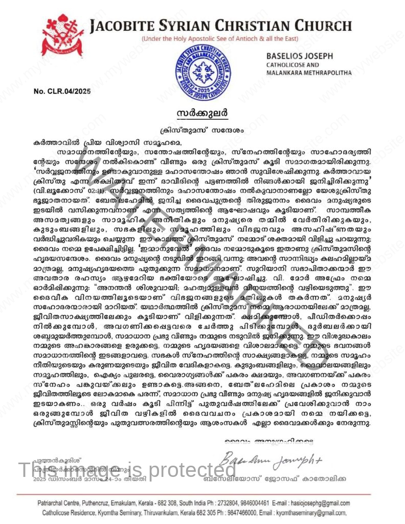 ശ്രേഷ്ഠ കാതോലിക്കായും മലങ്കര മെത്രാപ്പോലീത്തായുമായ ആബൂൻ മോർ ബസ്സേലിയോസ് ജോസഫ് ബാവായുടെ ക്രിസ്തുമസ് സന്ദേശം