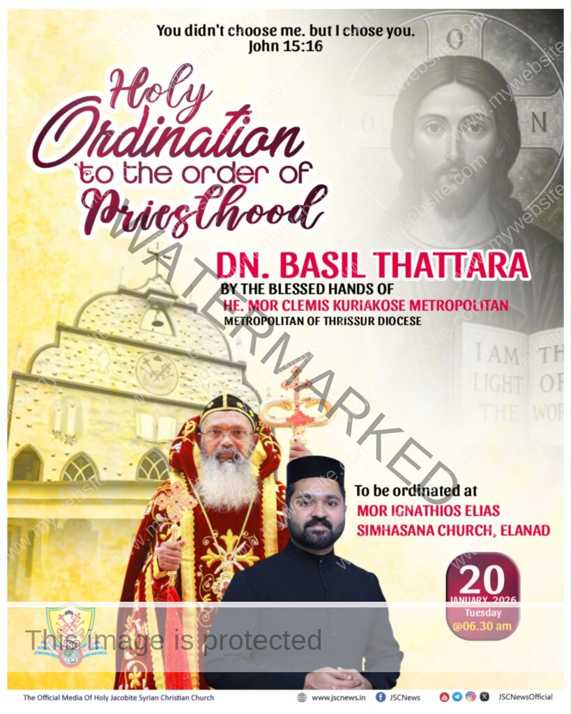 എളനാട് ● യാക്കോബായ സുറിയാനി ഓർത്തഡോക്സ് സഭയ്ക്ക് പുതുതായി ഒരു വൈദികൻ കൂടി. തൃശ്ശൂർ ഭദ്രാസനാധിപൻ അഭിവന്ദ്യ മോർ ക്ലീമീസ് കുര്യാക്കോസ് മെത്രാപ്പോലീത്തയുടെ തൃക്കരങ്ങളാൽ ഡീക്കൻ ബേസിൽ കുര്യാക്കോസ് തട്ടാറായിൽ നാളെ (ജനുവരി 20 ചൊവ്വ) കശ്ശീശ സ്ഥാനത്തേക്ക് ഉയർത്തപ്പെടുന്നു. എളനാട് മോർ ഇഗ്നാത്തിയോസ് ഏലിയാസ് സിംഹാസന പള്ളിയിൽ വച്ചാണ് പട്ടംകൊട ശുശ്രുഷകൾ നടക്കുന്നത്.