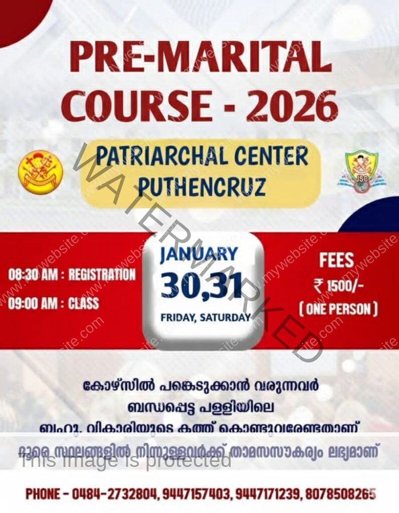 പുത്തൻകുരിശ് ● യാക്കോബായ സുറിയാനി ഓർത്തഡോക്സ് സഭയുടെ ആസ്ഥാനമായ പുത്തൻകുരിശ് പാത്രിയർക്കാ സെന്ററിൽ എല്ലാ മാസവും സംഘടിപ്പിക്കുന്ന പ്രീ-മാരിറ്റൽ കോഴ്സ് 2026 ജനുവരി 30, 31 (വെള്ളി, ശനി) തീയതികളിൽ നടക്കും.
