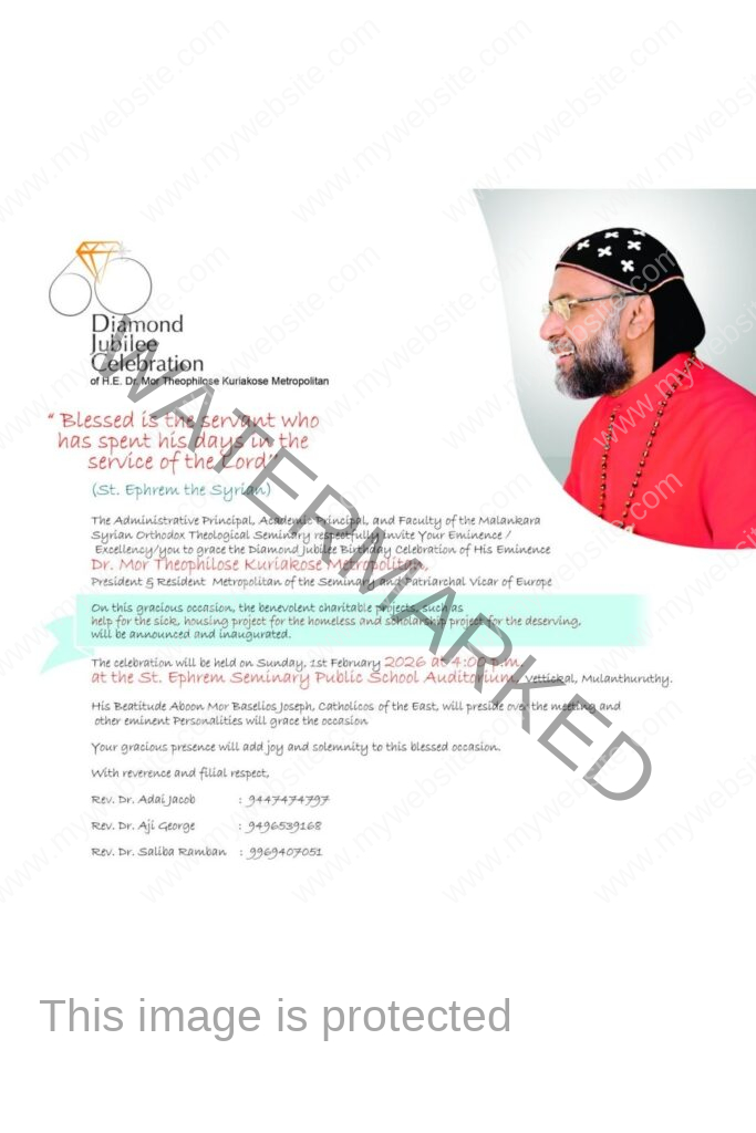 പുത്തൻകുരിശ് ● യാക്കോബായ സുറിയാനി ഓർത്തഡോക്സ് സഭയുടെ വെട്ടിക്കൽ എം.എസ്.ഒ.ടി സെമിനാരി റസിഡന്റ് മെത്രാപ്പോലീത്തയും യൂറോപ്പിലെ പാത്രിയാർക്കൽ വികാരിയും മീഡിയാ സെൽ ചെയർമാനുമായ അഭിവന്ദ്യ ഡോ. കുര്യാക്കോസ് മോർ തെയോഫിലോസ് മെത്രാപ്പോലീത്ത അറുപതിൻ്റെ നിറവിൽ. മെത്രാപ്പോലീത്തയുടെ ഷഷ്ട്യബ്ദപൂർത്തി ആഘോഷം ഫെബ്രുവരി 1 ഞായർ വൈകിട്ട് 4 മണിക്ക് മുളന്തുരുത്തി വെട്ടിക്കൽ സെന്റ് എഫ്രേം സെമിനാരി പബ്ലിക് സ്കൂൾ ഓഡിറ്റോറിയത്തിൽ നടക്കും.