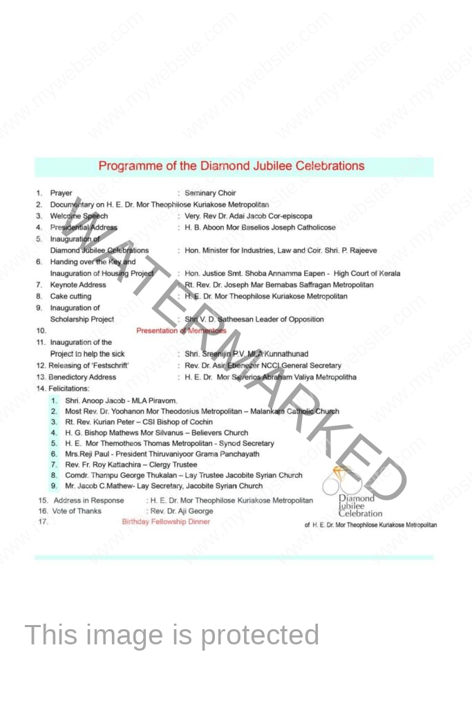 ഭവന പദ്ധതിയുടെ ഉദ്ഘാടനം ജസ്റ്റിസ് ശോഭ അന്നമ്മ ഈപ്പനും വിദ്യാഭ്യാസ സ്കോളർഷിപ്പ് പദ്ധതിയുടെ ഉദ്ഘാടനം പ്രതിപക്ഷ നേതാവ് വി.ഡി. സതീശനും നിർവഹിക്കും. മാർത്തോമ്മാ സഭയുടെ ജോസഫ് മാർ ബർണബാസ് സഫ്രഗൻ മെത്രാപ്പോലീത്ത മുഖ്യ പ്രഭാഷണവും യാക്കോബായ സുറിയാനി സഭയുടെ ഡോ. എബ്രഹാം മോർ സേവേറിയോസ് വലിയ മെത്രാപ്പോലീത്ത അനുഗ്രഹ പ്രഭാഷണവും നടത്തും.
