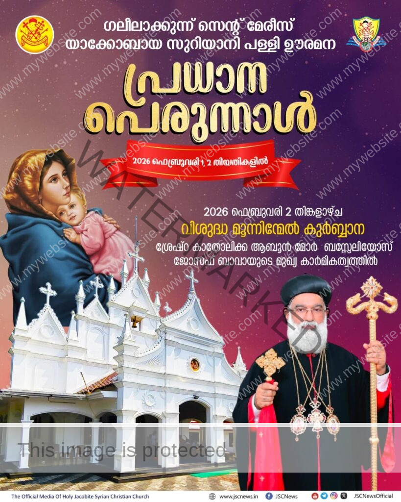 ഊരമന ● കണ്ടനാട് ഭദ്രാസനത്തിലെ ഊരമന ഗലീലാക്കുന്ന് വി. മർത്തമറിയം യാക്കോബായ സുറിയാനി പള്ളിയിൽ പ്രധാനപ്പെരുന്നാൾ ആരംഭിച്ചു. പെരുന്നാളിനോടനുബന്ധിച്ച് ഭക്ത സംഘടനകളുടെ സംയുക്ത വാർഷികവും കലാപരിപാടികളും നടന്നു.