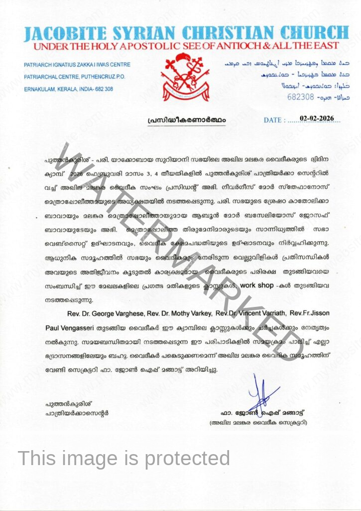 പുത്തന്കുരിശ് ● പരി. യാക്കോബായ സുറിയാനി ഓർത്തഡോക്സ് സഭയിലെ അഖില മലങ്കര വൈദീകരുടെ ദ്വിദിന ക്യാമ്പ് 2026 ഫെബ്രുവരി 3, 4 തീയതികളില് പുത്തന്കുരിശ് പാത്രിയര്ക്കാ സെന്ററില് വച്ച് അഖില മലങ്കര വൈദീക സംഘം പ്രസിഡന്റ് അഭി. ഗീവര്ഗീസ് മോര് സ്തേഫാനോസ് മെത്രാപ്പോലീത്തായുടെ അധ്യക്ഷതയില് നടത്തപ്പെടുന്നു.