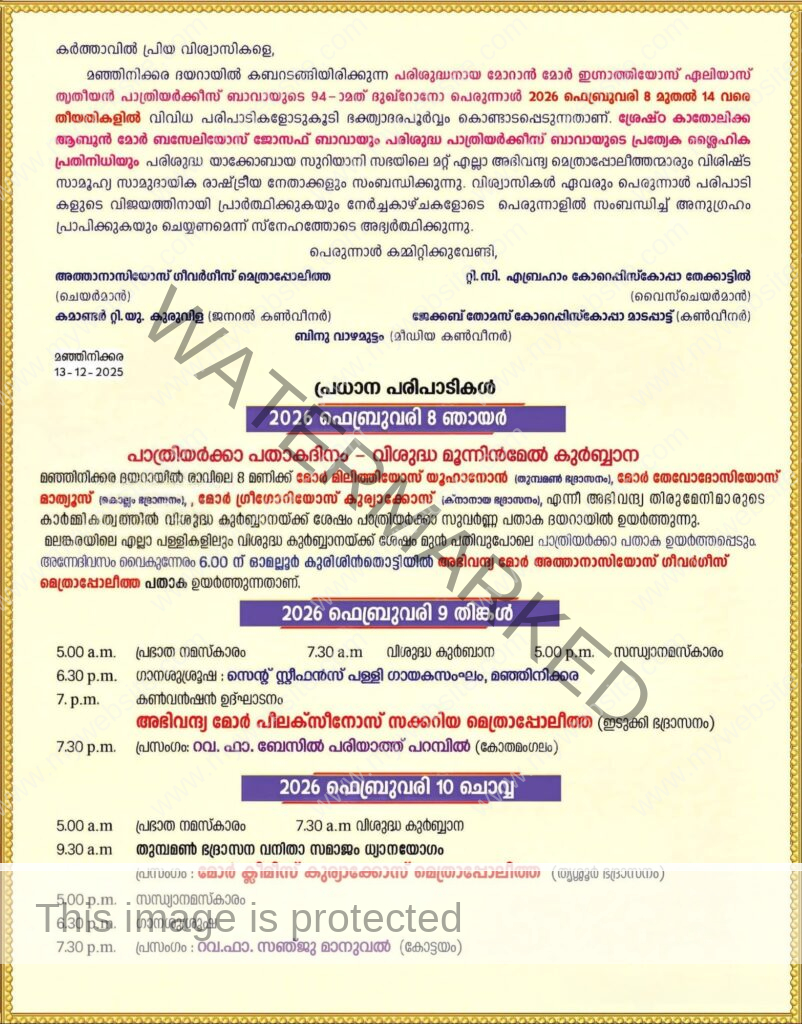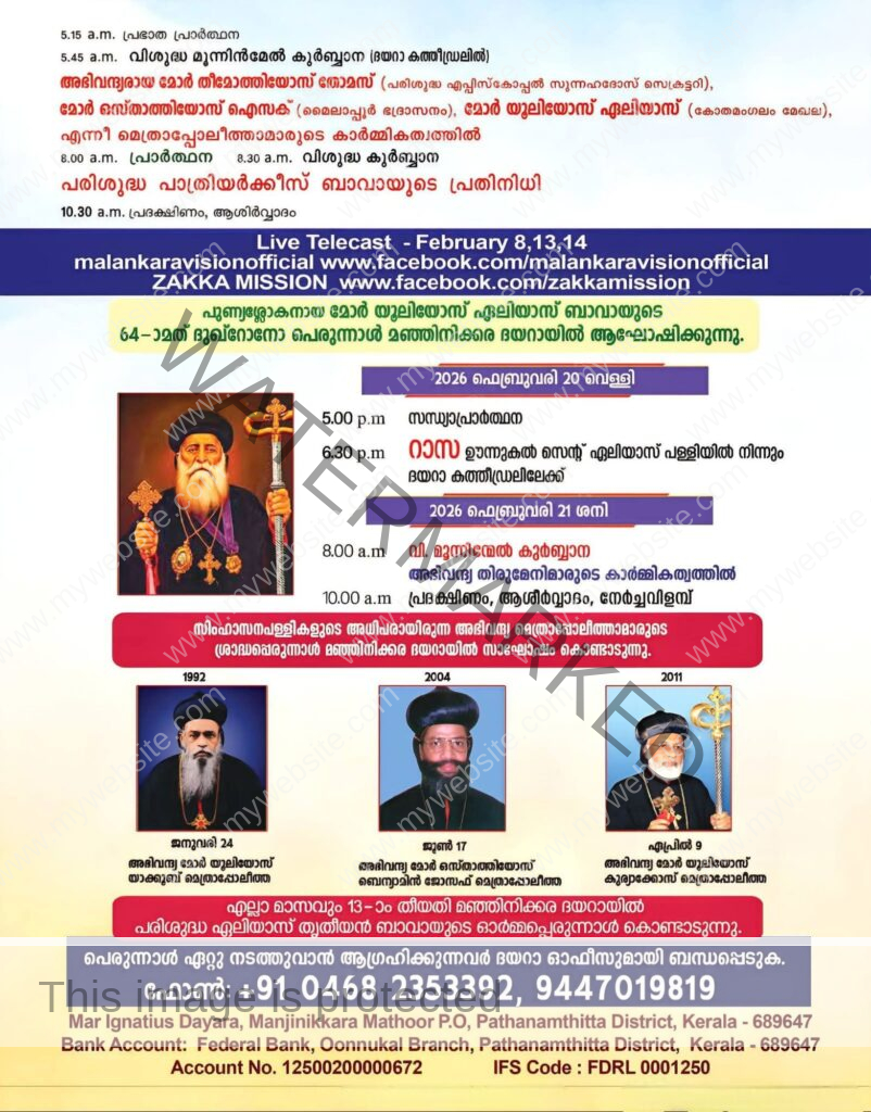 ഫെബ്രുവരി 13-ാം തീയതി വെള്ളിയാഴ്ച രാവിലെ 5 മണിക്ക് പ്രഭാത നമസ്കാരവും 7.30-ന് ശ്രേഷ്ഠ കാതോലിക്കായും മലങ്കര മെത്രാപ്പോലീത്തായുമായ ആബൂന് മോര് ബസ്സേലിയോസ് ജോസഫ് ബാവായുടെ മുഖ്യ കാര്മികത്വത്തിലും പൗരസ്ത്യ സുവിശേഷം സമാജത്തിന്റെ അഭിവന്ദ്യ മോര് ക്രിസോസ്റ്റമോസ് മര്ക്കോസ്, ക്നാനായ ഭദ്രാസനത്തിന്റെ മോര് ഈവാനിയോസ് കുര്യാക്കോസ് എന്നീ മെത്രാപ്പോലീത്തമാരുടെ സഹ കാര്മികത്വത്തിലും വിശുദ്ധ മൂന്നിന്മേല് കുര്ബ്ബാന നടക്കും.