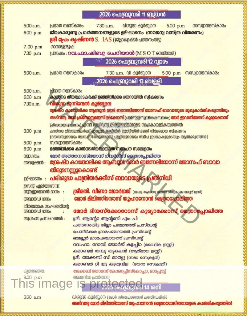 ഫെബ്രുവരി 11-ാം തീയതി ബുധനാഴ്ച വൈകിട്ട് 6 മണിക്ക് ജീവകാരുണ്യ പ്രവര്ത്തനങ്ങളുടെ ഉദ്ഘാടനം പത്തനംതിട്ട ജില്ലാ കളക്ടർ പ്രേം കൃഷ്ണൻ എസ്. ഐ.എ.എസ്. നിർവഹിക്കും. 94 നിര്ദ്ധനരായ ആളുകള്ക്ക് അരിയും വസ്ത്രങ്ങളും വിതരണം ചെയ്യും. അതിനു ശേഷം 7 മണിക്ക് ഗാനശുശ്രൂഷയും 7.30-ന് ഫാ. ഷിബു ചെറിയാന് (എം.എസ്.ഒ.ടി സെമിനാരി, മുളന്തുരുത്തി) പ്രസംഗവും നടക്കും. ഫെബ്രുവരി 12-ാം തീയതി വ്യാഴാഴ്ച രാവിലെ 5 മണിക്ക് പ്രഭാത നമസ്ക്കാരം, 7.30-ന് വിശുദ്ധ കുര്ബ്ബാന, വൈകിട്ട് 5 മണിക്ക് സന്ധ്യാപ്രാര്ത്ഥന, എന്നിവ ഉണ്ടായിരിക്കും.