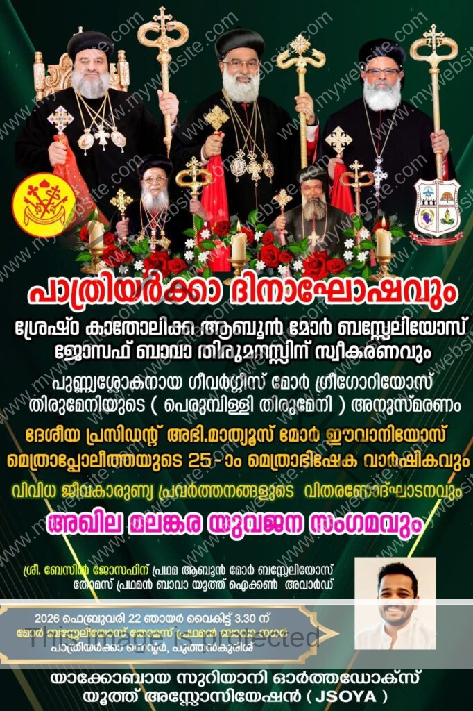 പുത്തൻകുരിശ് ● യാക്കോബായ സുറിയാനി ഓർത്തഡോക്സ് യൂത്ത് അസ്സോസിയേഷൻ്റെ (ജെ.എസ്.ഒ.വൈ.എ) ആഭിമുഖ്യത്തിൽ അഖില അഖില മലങ്കര യുവജന സംഗമവും പാത്രിയർക്കാ ദിനാഘോഷവും ഫെബ്രുവരി 22 ഞായറാഴ്ച വൈകിട്ട് 3.30-ന് പുത്തൻകുരിശ് പാത്രിയർക്കാ സെന്ററിലെ മോർ ബസ്സേലിയോസ് തോമസ് പ്രഥമൻ നഗറിൽ നടക്കും.