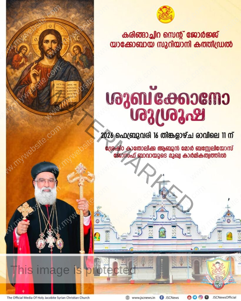 കരിങ്ങാച്ചിറ ● ആഗോള ജോർജിയൻ തീർത്ഥാടന കേന്ദ്രമായ കരിങ്ങാച്ചിറ സെന്റ് ജോർജ്ജ് യാക്കോബായ സുറിയാനി കത്തീഡ്രലിൽ നാളെ (ഫെബ്രുവരി 16 തിങ്കളാഴ്ച) രാവിലെ 11 മണിക്ക് ശുബ്ക്കോനോ (നിരപ്പിൻ്റെ) ശുശ്രൂഷ നടക്കും.