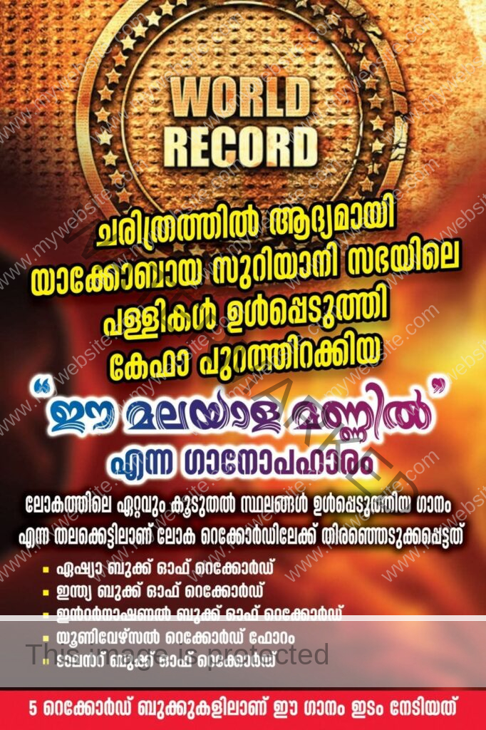 പുത്തൻകുരിശ് ● യാക്കോബായ സുറിയാനി ഓർത്തഡോക്സ് സഭയുടെ പള്ളികളെ ഒരേ സ്വരതാളത്തിൽ കോർത്തിണക്കിയ ‘കേഫാ’യുടെ സംഗീത സമർപ്പണം “ഈ മലയാള മണ്ണിൽ” ലോക റെക്കോർഡുകളുടെ പൊൻതൂവലണിഞ്ഞ നേട്ടമായി ഉയർന്നു. ലോകത്തിലെ ഏറ്റവും കൂടുതൽ സ്ഥലങ്ങളെ ഉൾപ്പെടുത്തി രൂപകൽപ്പന ചെയ്ത ഗാനം എന്ന അപൂർവ്വ ബഹുമതിയാണ് ഈ സംഗീത വിരുന്നിനെ തേടിയെത്തിയത്.